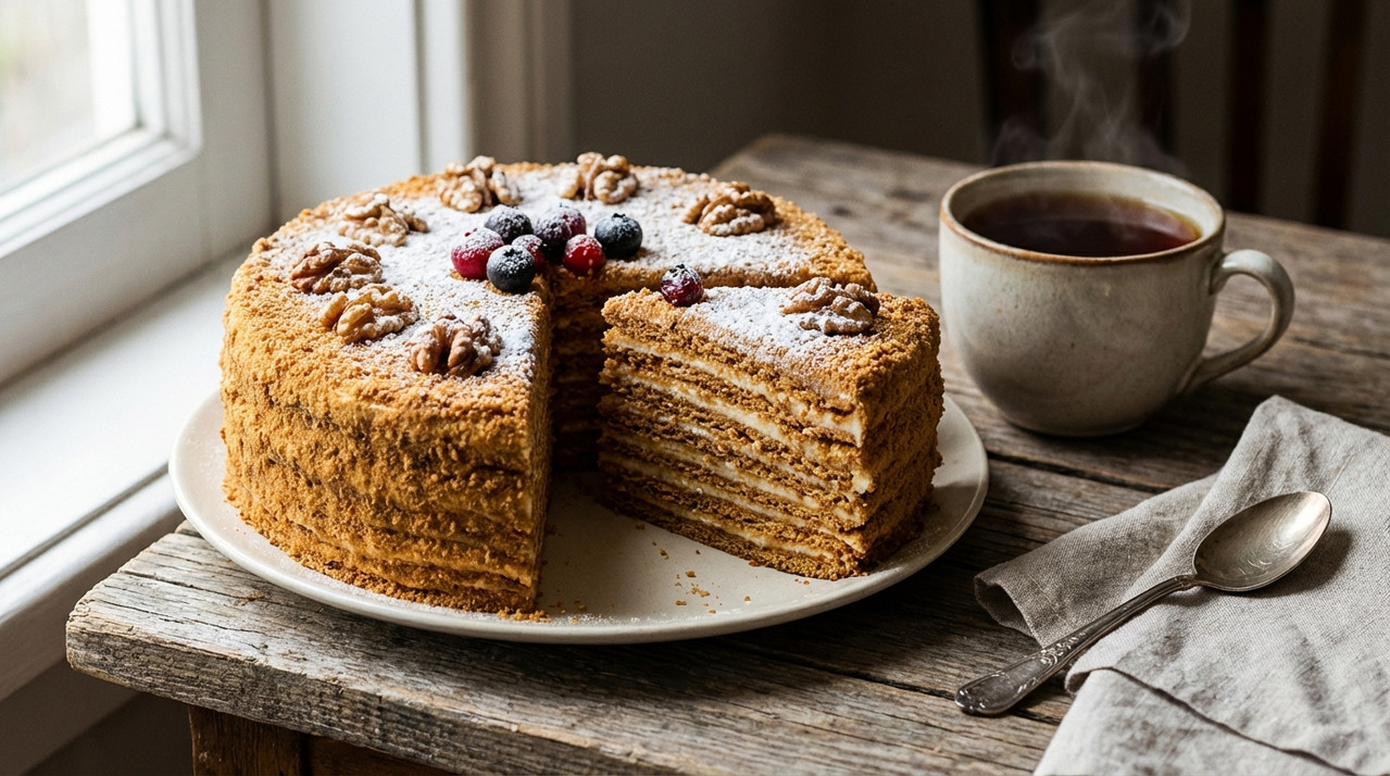 Medovik isn’t just a dessert; it’s a story of patience. My first attempt was a disaster—too much baking soda, and the layers cracked like cheap pottery. I ended up with a honey‑soaked brick that my cousins politely called “edible mud.” After a few tries, I learned the secret: let the honey cool just enough to thicken, then whisk it into the egg‑sugar mixture until it’s glossy and smooth. The batter should look like liquid gold, not a slurry.